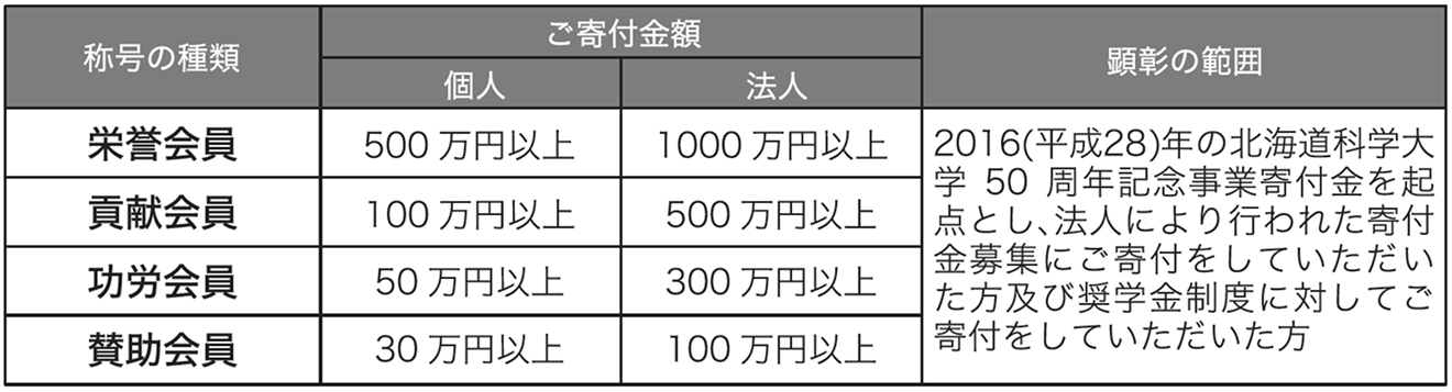 また、会員の方は、北海道科学大学A棟塔時計横に「学校法人北海道科学大学 御芳名一覧」として掲載させていただいております。