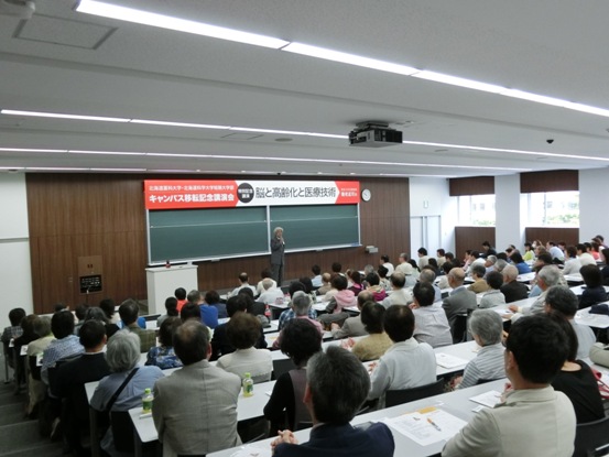 この講演会は、平成27年4月より北海道薬科大学および北海道科学大学短期大学部が前田キャンパスに移転し、3大学がこの前田キャンパスに集約されたことを記念して行われたもので、今回、定員を超える参加申込をいただいたことから、講演会場のほかに、別の講義室でスクリーンを通して講演をお聞きいただきました。