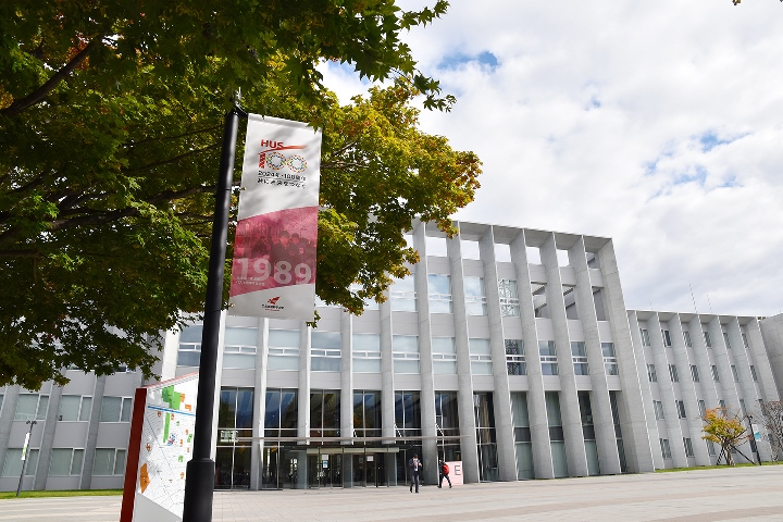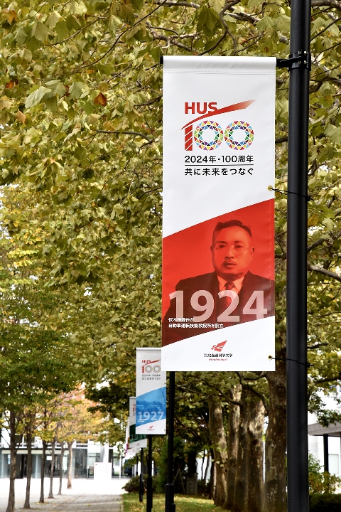 前田キャンパスE棟前プロムナード、D棟・F棟前に法人創立100周年を記念するフラッグを設置しました。