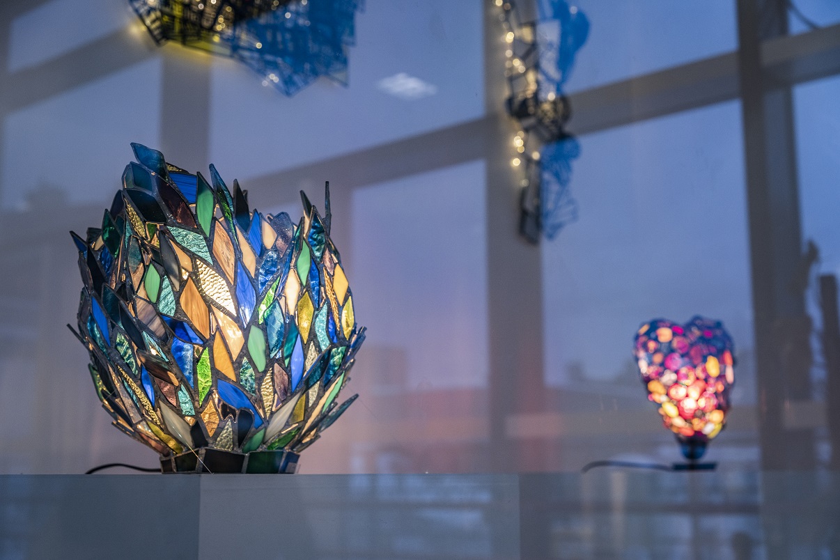 HUSキャンパス・イルミネーション2021では、新たな試みとして本学正面バス待合室に、光のオブジェをデザインした本学客員教授でステンドグラスアーティストのMie氏が手掛けたハートや太陽などをモチーフとした、ステンドグラス風アートを展示しました。