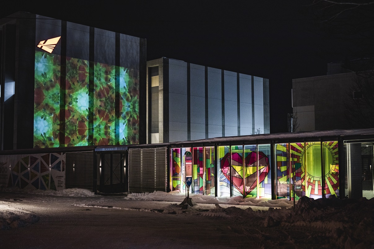 A棟壁面に投影された万華鏡と、バス待合室のステンドグラス風アート