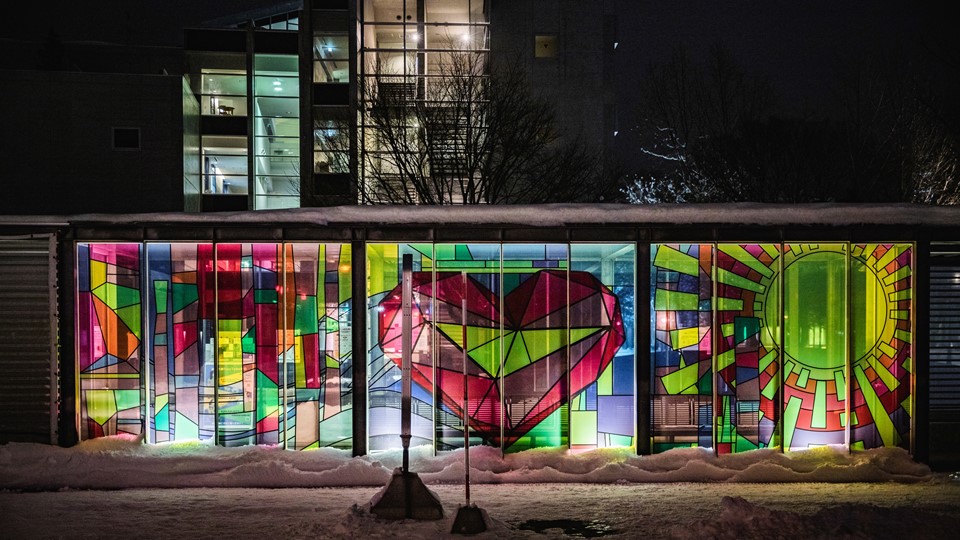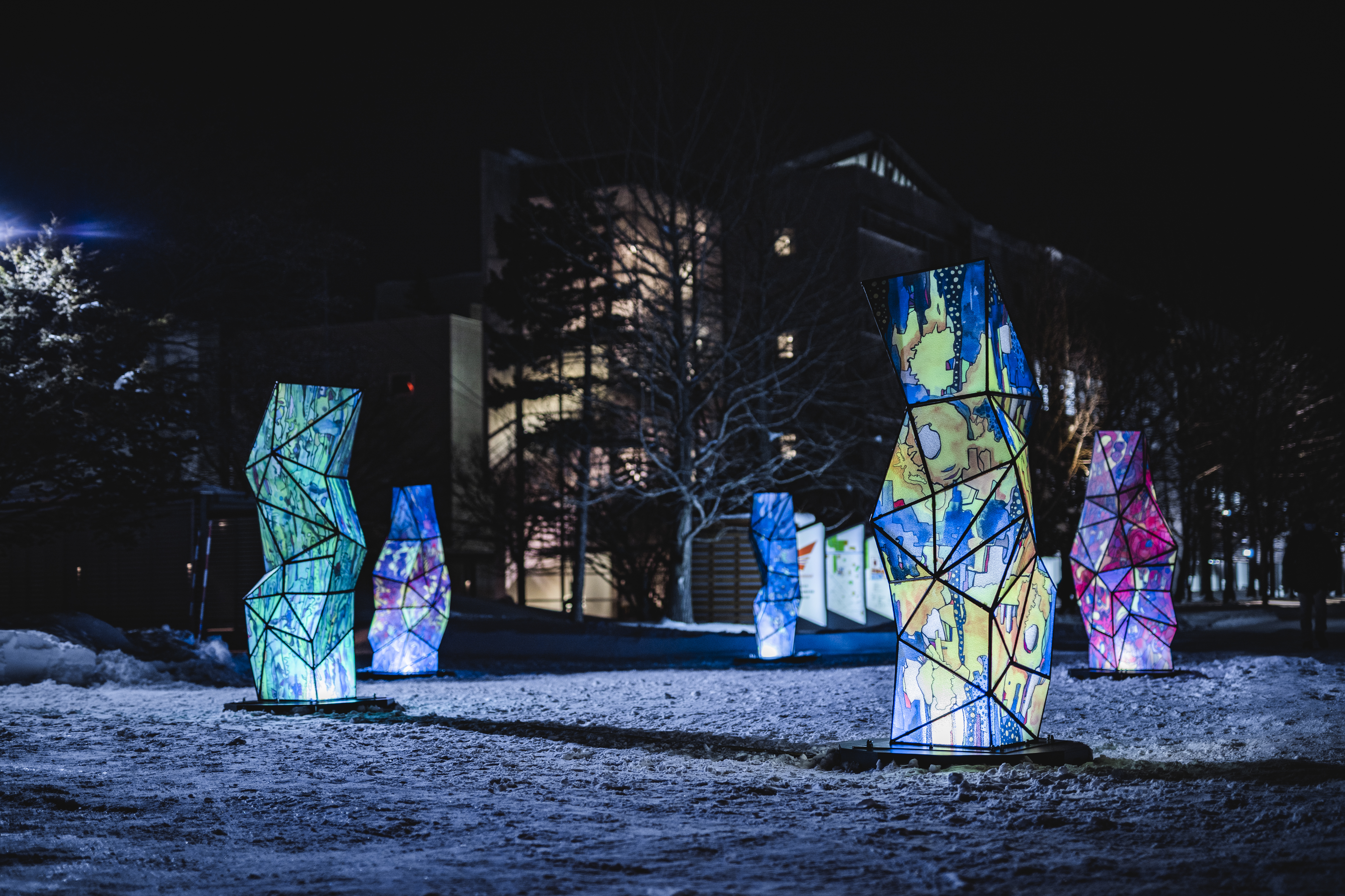 ステンドグラスアーティストで本学客員教授を務めるmieがプロデュースするステンドグラスをあしらった14本の光のオブジェと光のアートがメインプロムナードやバス停などキャンパスを彩ります。