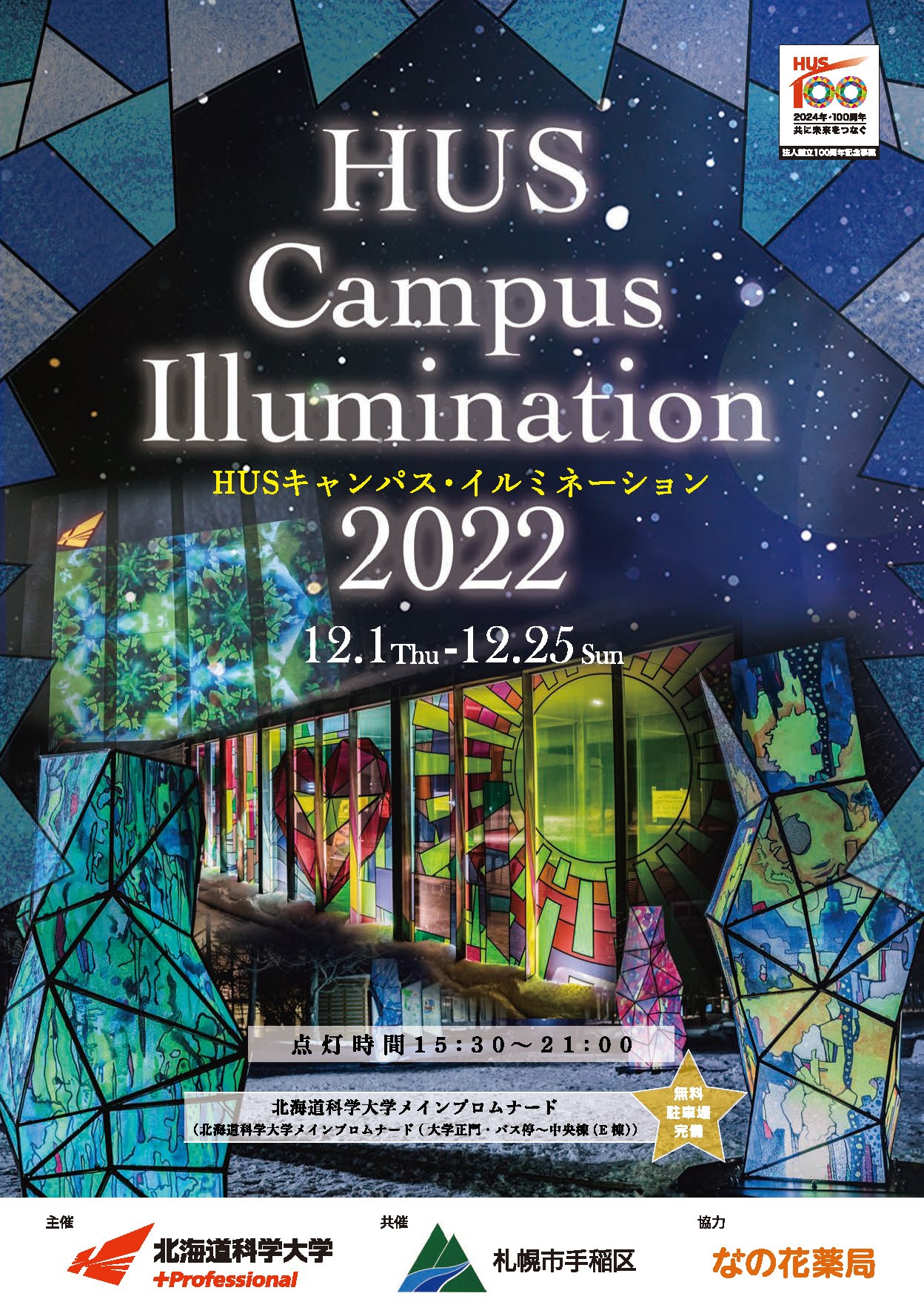 HUS キャンパス・イルミネーションは、本学の開学50周年を期に皆様からいただいた寄付を元に制作したことに始まり、今年で6年目を迎えます。今年は3年ぶりに参加型のイベントを開催します。ぜひ皆様でお越しください。